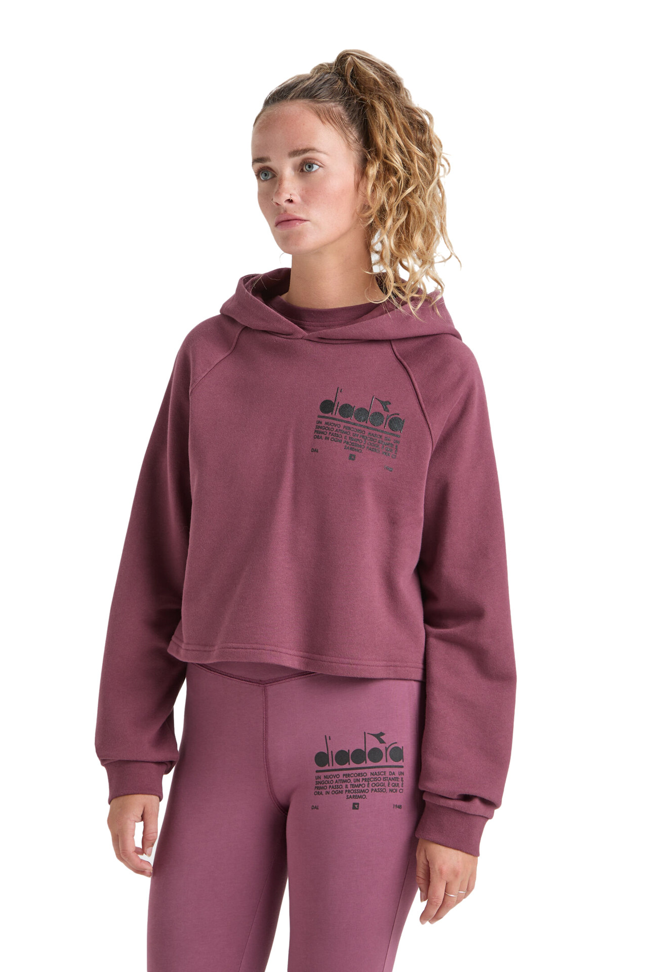 Hanorac marca Diadora pentru Femei, model: L. Hoodie Crop Manifesto, culoare Mov. Confectionat din material Bumbac, este recomandat pt. Activitate Zilnica, in sezonul Toamna - Iarna.Detalii